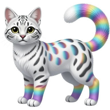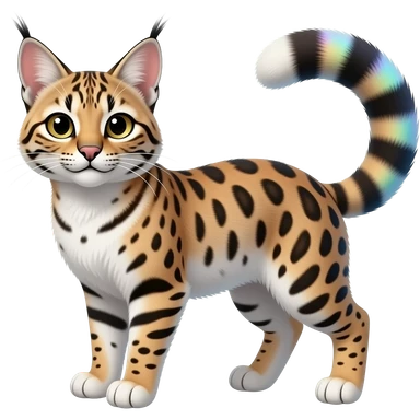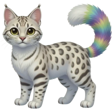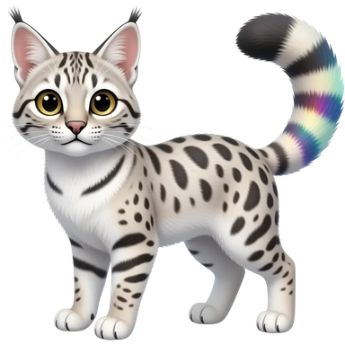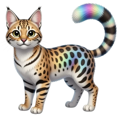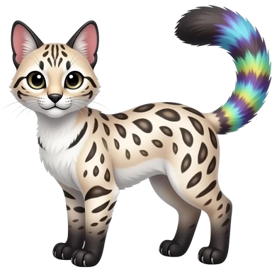 White soft silky smooth vernid-Civet-Genet-Bengal-Cat-Bobcat-Caracal-Serval-animal-hybrid-mix fantasy creature LiLaiRa Kamirah Falvie whiskers paws full body with colorful gradient iridescent patterns fur markings and with a long thin tufted tail feline emoji