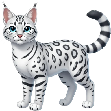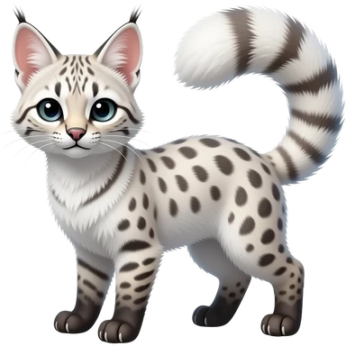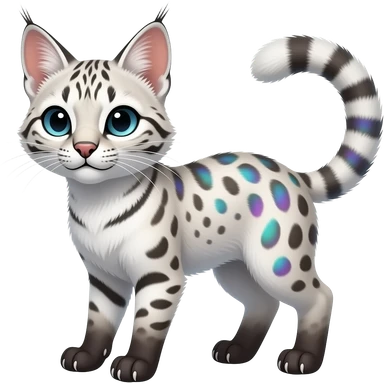 White soft silky smooth vernid-Civet-Genet-Bengal-Cat-Bobcat-Caracal-Serval-animal-hybrid-mix fantasy creature LiLaiRa Kamirah Falvie whiskers paws full body gradient iridescent patterns tufted tail feline emoji