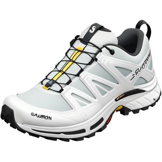 White Salomon XT-6 Gore-Tex trail running shoes, one positioned behind the other, simplified iOS emoji style, technical outdoor sneakers with trail sole, clean white colorway, minimalist design emoji | AI Emoji Generator