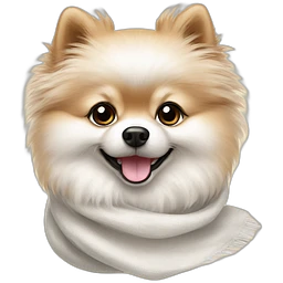 Pomeranian with a white scarf with flowers painted on it on his head emoji
