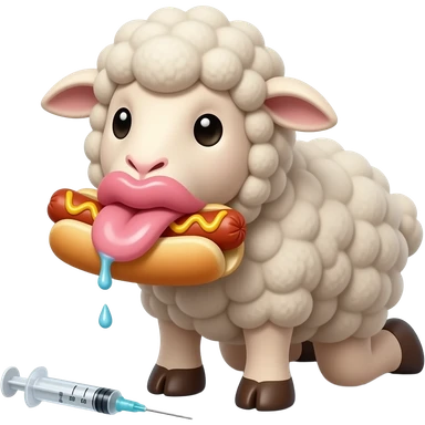 sheep plush on its knees eating swallowing a hotdog in its mouth with big wet squishy big puffy lips with a syringe on the floor with no teeth emoji