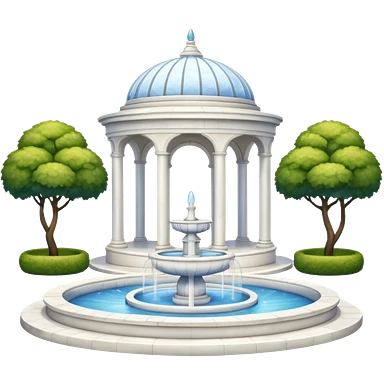 White luxurious expensive shiny new brilliant gorgeous marble pavilion with benches and a garden and a marble fountain emoji