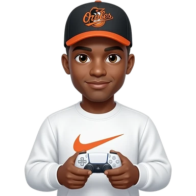 black skinned 22 year old man with a brown low taper fade holding a white ps5 controller in a orioles baseball hat wearing a white nike tech sweatshirt emoji