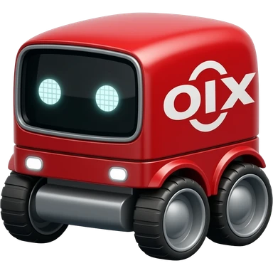 Solid rectangle delivery robot with a logo showing oyka emoji