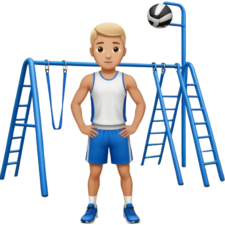 white sportsman in the playground with ball, dressed in sport suit on sports horizontal bars emoji