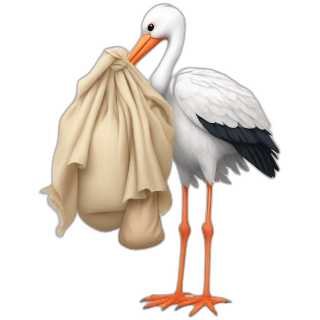 white stork carrying a bundle of cloth in its beak that has a baby human with light skin and dark hair and the baby face is peeking out from the cloths bundle the strok is carryingemoji