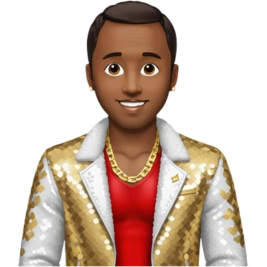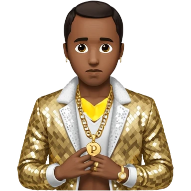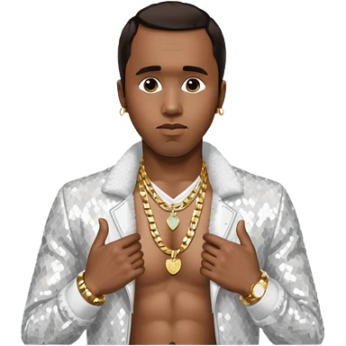 P. Diddy with dark brown hair, white sequin jacket, shirtless with necklace emoji
