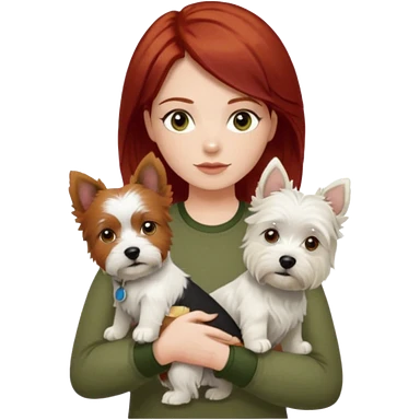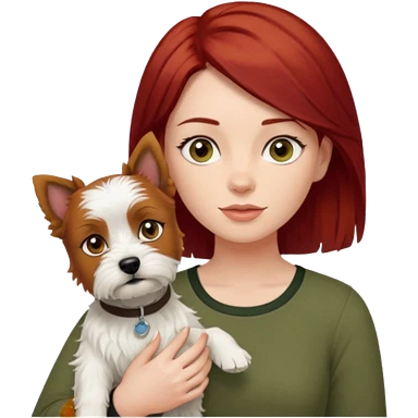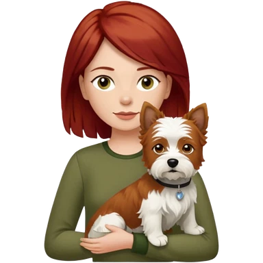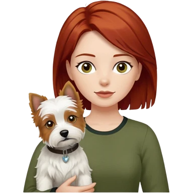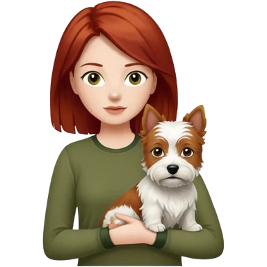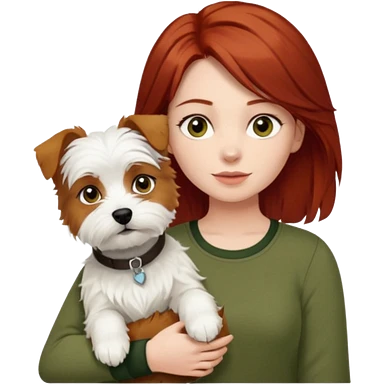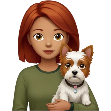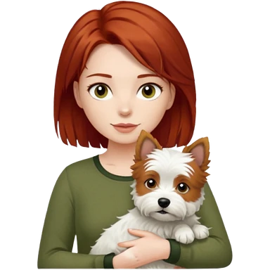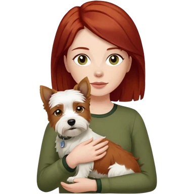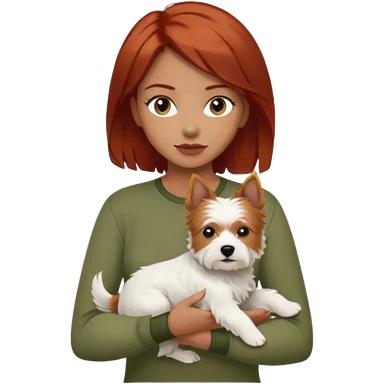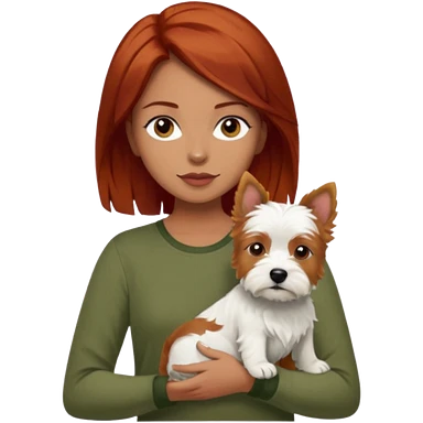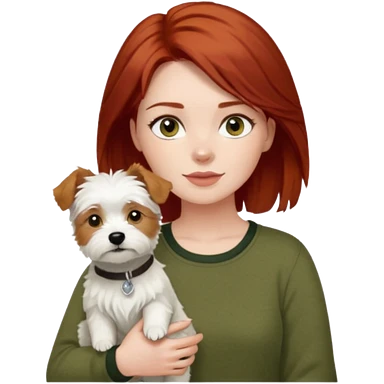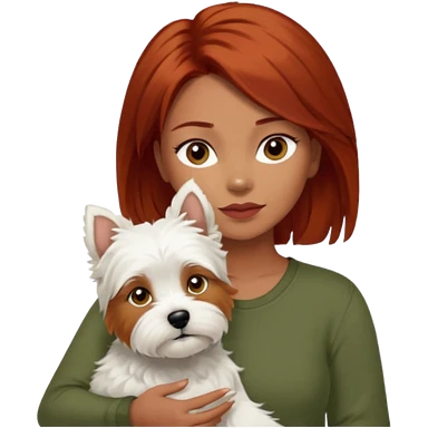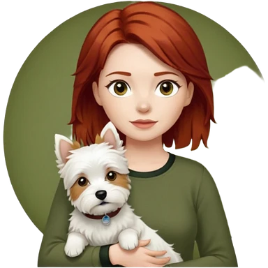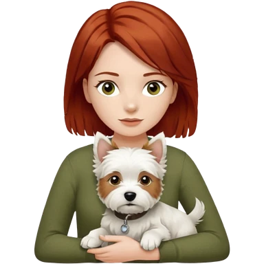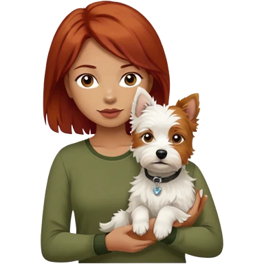white terrier dog being held by woman with dark red long hair and hazel eye wearing olive green top emoji | AI Emoji Generator