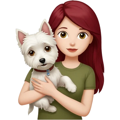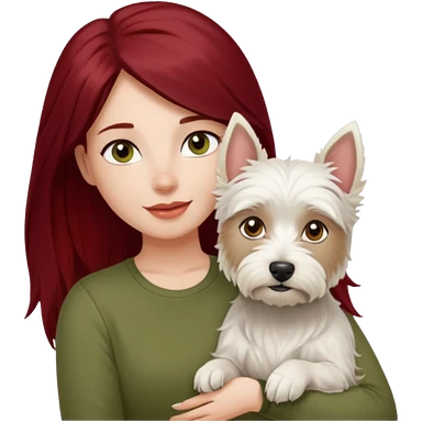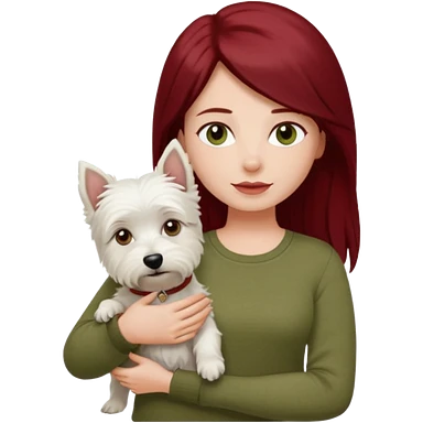 Westhighland white terrier dog being held by woman with dark shoulder length red hair and hazel eye wearing olive green top emoji
