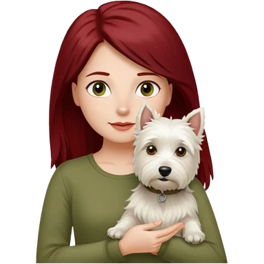 Westie white terrier dog being held by woman with dark red long hair and hazel eye wearing olive green top emoji