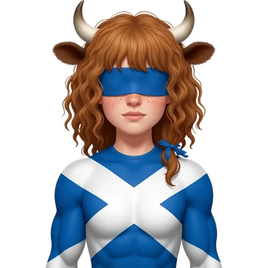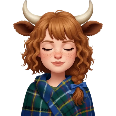 buff curly woman with freckles with messy light brown bangs covering the eyes with cow horns and cow brown ears with ribbon in her hair with body covered in Scottish flag like a blanket emoji