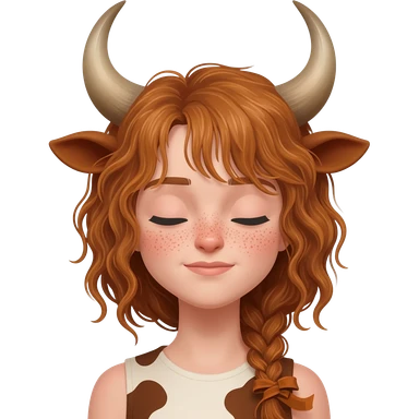 curly woman with freckles with messy light brown bangs covering the eyes with cow horns and cow brown ears with ribbon in her hair emoji