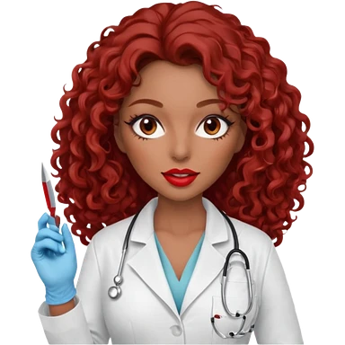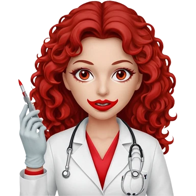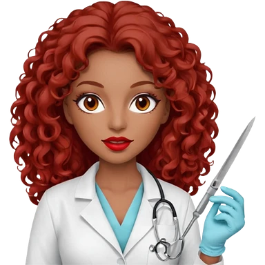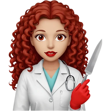 Seductress woman scalpel in hand, evil surgeon sexy surgeon clothes. She has red eyes. Her brown long curly hair. Wears sexy doctor outfit with red gloves. make her hair free and brown but she wear mouth cover to hide. Wears white surgeon jacket and only death long , long beown hair emoji