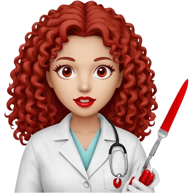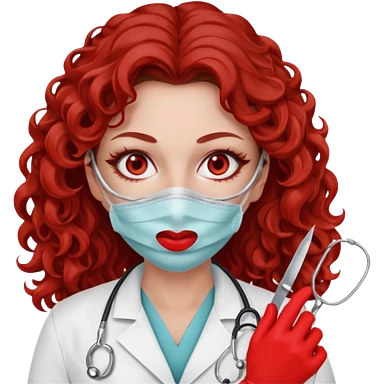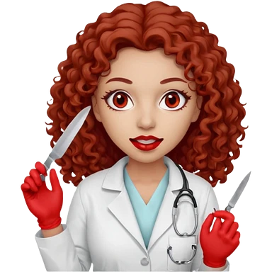 Scary woman scalpel in hand, evil surgeon sexy surgeon clothes. She has red eyes. Her brown long curly hair. Wears sexy doctor outfit with red gloves. make her hair free and brown but have mouthy wear mask to hide. Wears white surgeon jacket and has lon* brown hair. emoji
