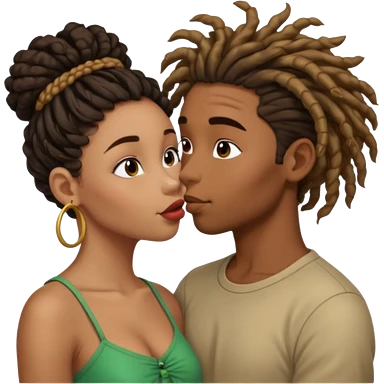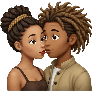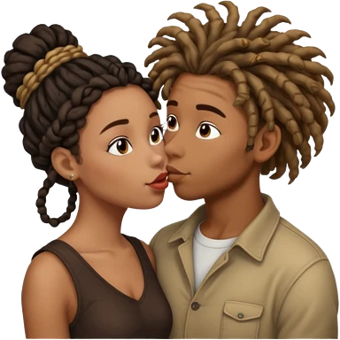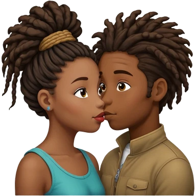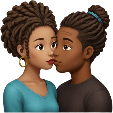 Brown boy with dreadlock kissing black girl with curly bun emoji