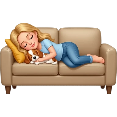 White woman with Long blond hair sleeping on sofa covered with blanket with a sleeping White/red cockerspaniel emoji | AI Emoji Generator