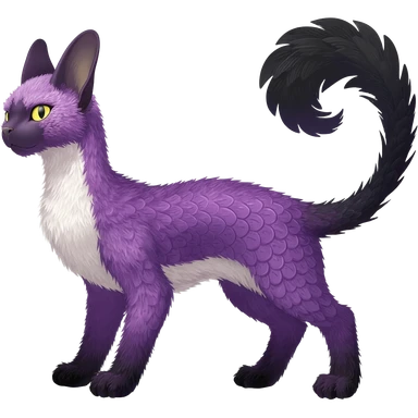 Furry, fluffy feathery scaly, Purple, white, black, Minccino-Sphynx-Lykoi-Linoone-Zangoose-fusion-hybrid-animal-Fakémon-creature, full body, thin long sleek scaly tail, intricate markings emoji