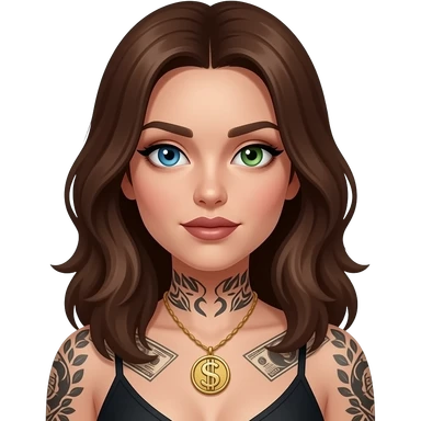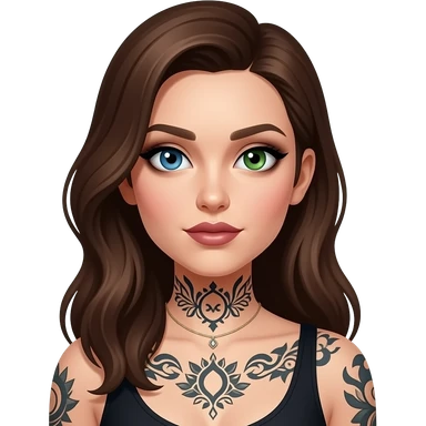 One blue eye one green eye pale white woman with brown hair and dark feminine makeup and body tattoos emoji