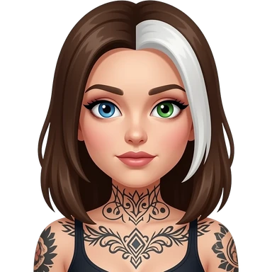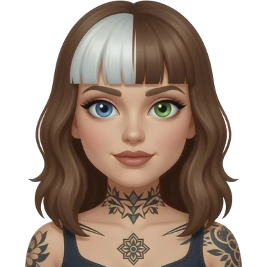 One blue eye one green eye pale white woman with brown hair with white streak in front and dark feminine makeup and body tattoos emoji