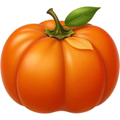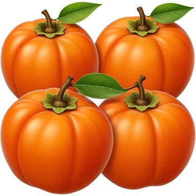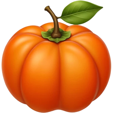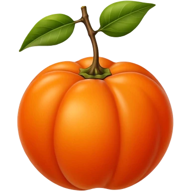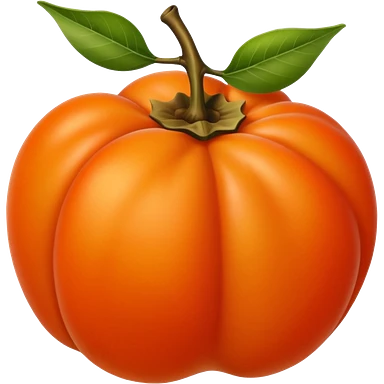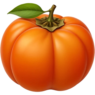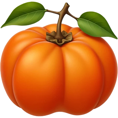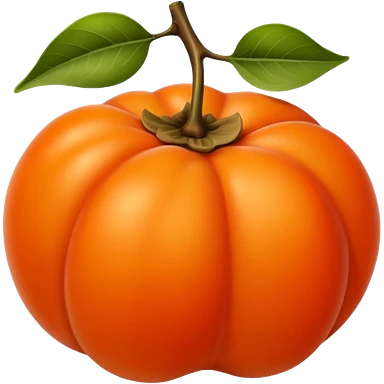 whole persimmon fruit with smooth glossy orange skin, flattened round shape, green leafy calyx on top with soft folds and natural texture, slightly dimpled surface suggesting ripeness and firmness, no leaf cut or extras, soft lighting, subtle shadows, emoji scaleemoji