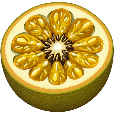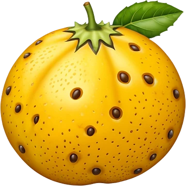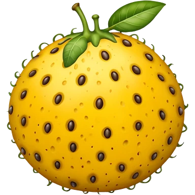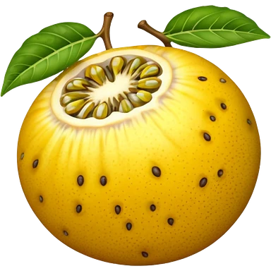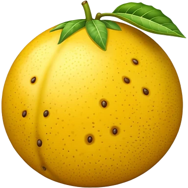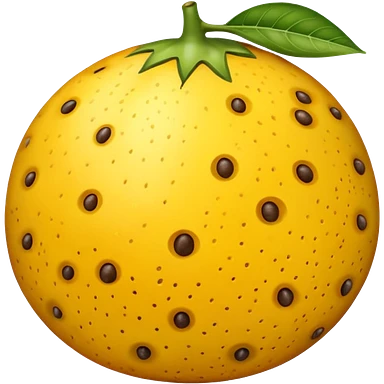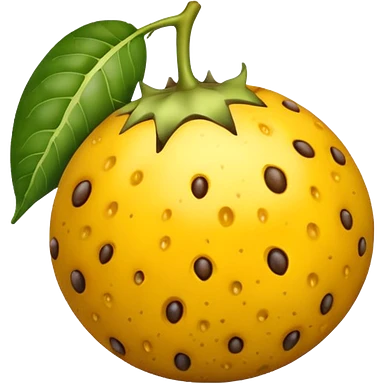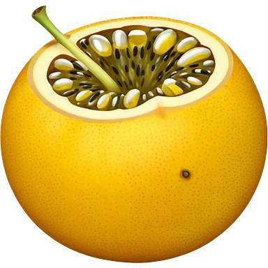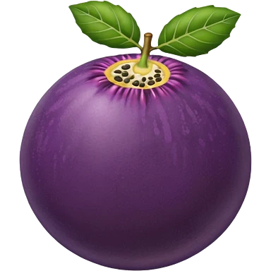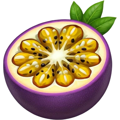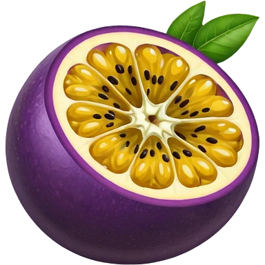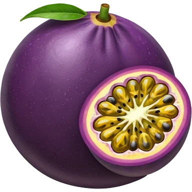 whole round purple passion fruit with slightly wrinkled matte skin next to halved piece showing vibrant yellow pulp with glossy black seeds juicy jelly-like texture bold contrast between rind and interior no leaf spoon or extras soft lighting subtle shadows emoji scale emoji | AI Emoji Generator