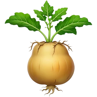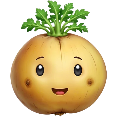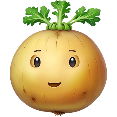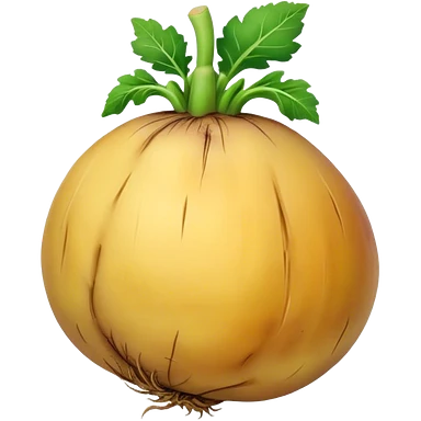 whole rutabaga root, rounded bulbous shape, rough textured skin, mottled purple beige yellow tones, trimmed stem remnants, faint root hairs, fresh earthy, soft lighting, subtle shadows, emoji scale, transparent background emoji | AI Emoji Generator