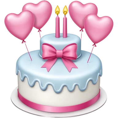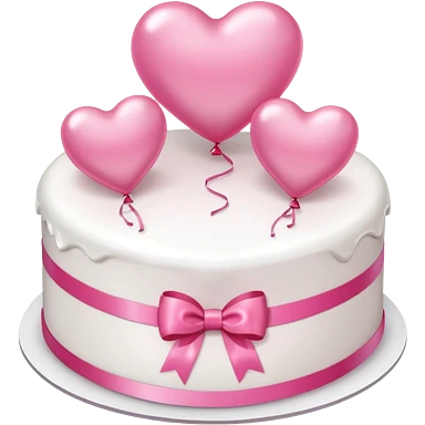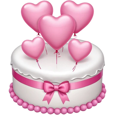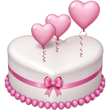 white heart shaped birthday cake with pink bow, pink balloons in background emoji