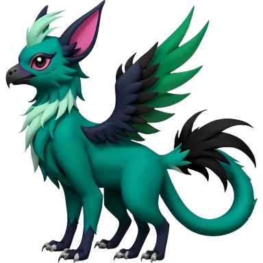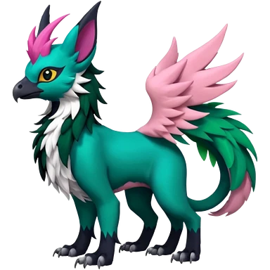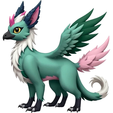 Dark-deep-Emerald-green gryphon-Trico-Nargacuga-Absol-Leafeon-Sprigatito-fusion-hybrid with a long tufted tail, black beak, pink accents, black claws, black tail, majestic, realistic, furry (full body) emoji
