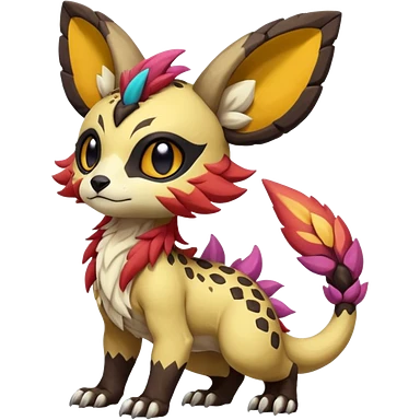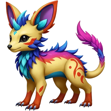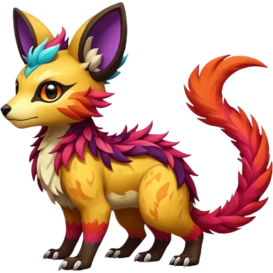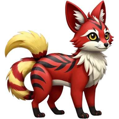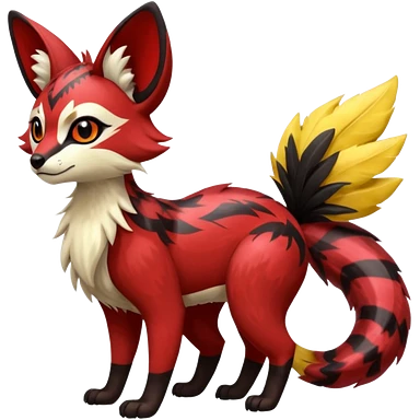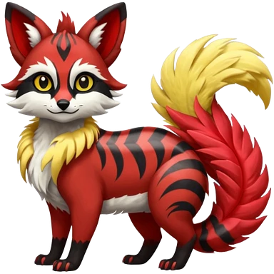 Futuristic sanguine-red banana-yellow black chevron-marked furry fluffy floofy feathery tribal marked Genet-Absol-Kyurem-Zeraora-Primagen-fusion-creature emoji