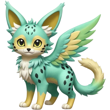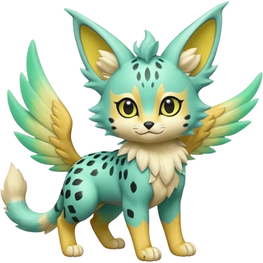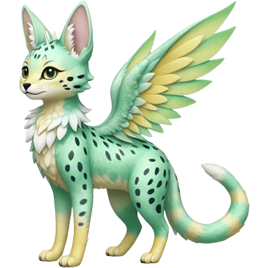 Epic complex detailed pastel minty green, pastel beige yellow pastel realistic aesthetic-scenic-Fakémon-Zorua-Litten-Trico-Sergal-Serval-Vernid-creature (full body) with far wings, shiny sparkly fairycore theme emoji