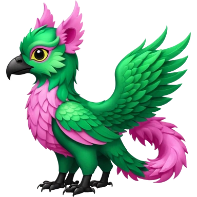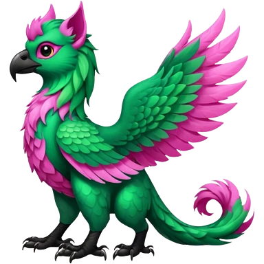 Emerald-green gryphon with a long tufted tail, black beak, pink swirly pattern markings, black claws, black tail, majestic, realistic, furry (full body) emoji