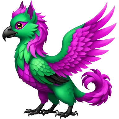Emerald-green gryphon with a long tufted tail, black beak, magenta swirly pattern markings, black claws, black tail, majestic, realistic, furry (full body) emoji