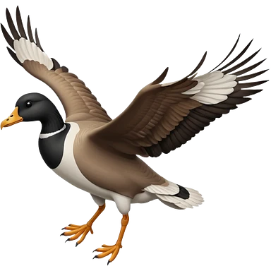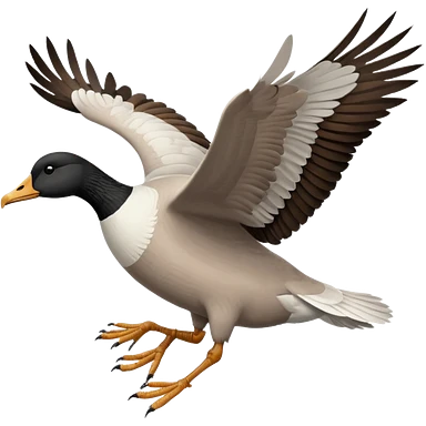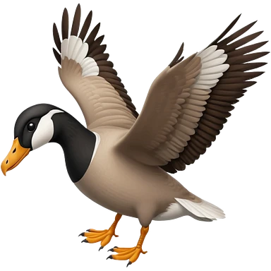wild goose in flight, with black neck, black feet, brown wings, black-and-white head, white belly emoji