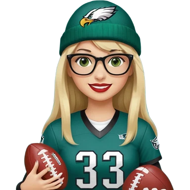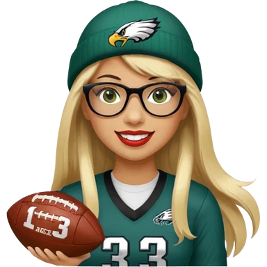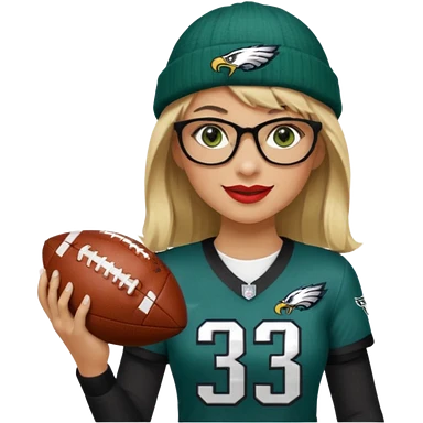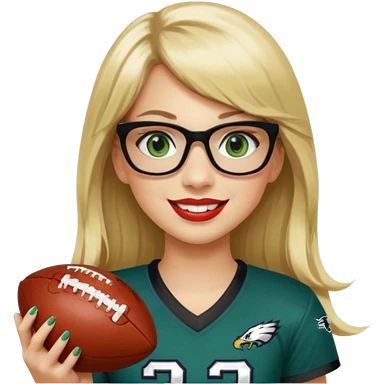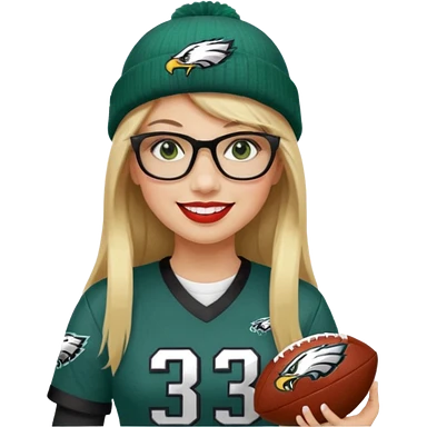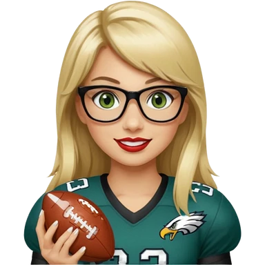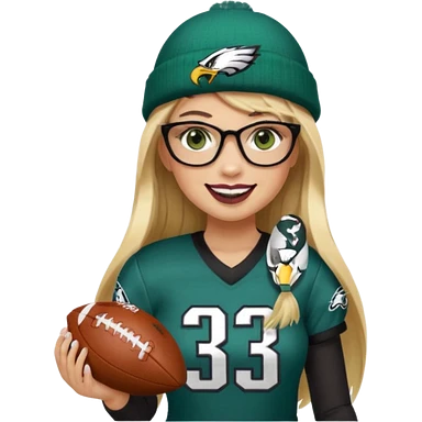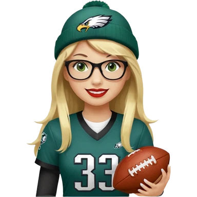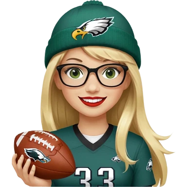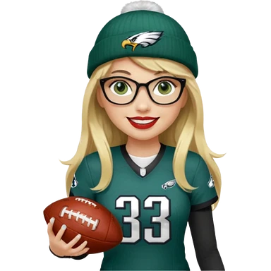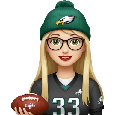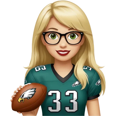 long blonde hair with bangs black rectangle glasses female green eyes football player wearing eagles jersey number 33 holding football emoji