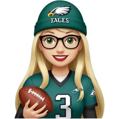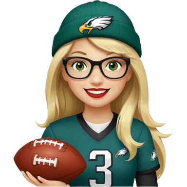 full length women wearing eagles uniform, long straight blonde hair, bangs, green eyes, black rectangle glasses, holding football, number 33, smiling, lipstick, eagles beanie emoji