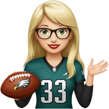 long blonde hair with bangs small black rectangle glasses female green eyes football player wearing eagles jersey number 33 holding football emoji