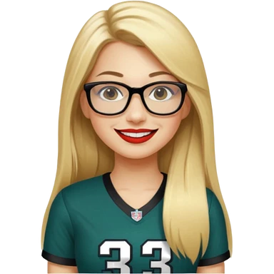 long blonde hair with bangs black rectangle glasses female green eyes football player wearing eagles jersey number 33 emoji