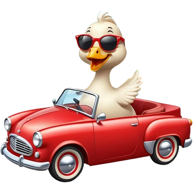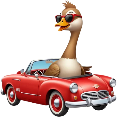 A cheerful goose wearing sunglasses, driving a vintage red convertible car with a big smile, wind blowing through its feathers, on a sunny day with a scenic background. emoji
