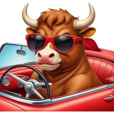 A bull driving a vintage red convertible car, wearing sunglasses, with a confident smirk, wind blowing through its fur, on a sunny day, cartoonish and vibrant style. emoji