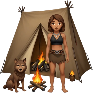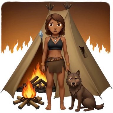 a NEANDERTHAL WOMAN WITH BROWN HAIR STANDING BY A FIRE AND TENT WITH BLACK WOLF emoji
