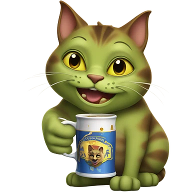shrek-style cat drinking beer in a emoji-poop-like cup emoji