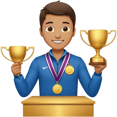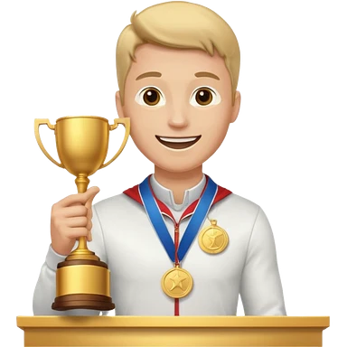 winner ceremony with one guy standing in a winner's podium and having a medal around his neck and holding a trophy emoji