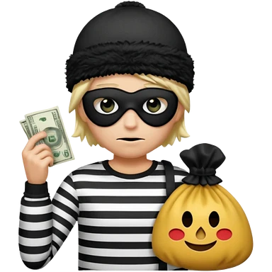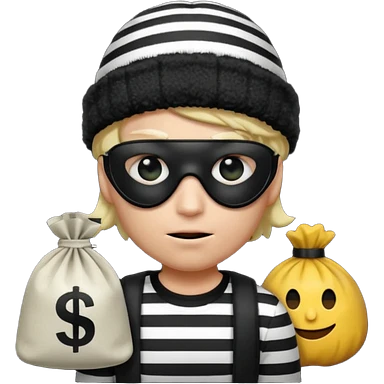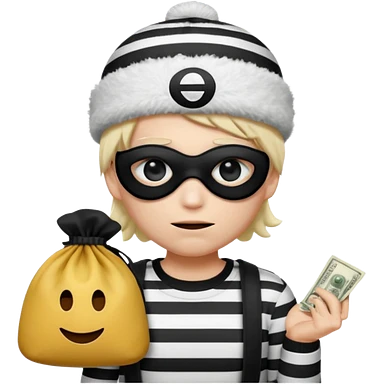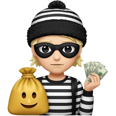 a short ios emoji-style portrait of a classic burglar, a black eye mask and a black-and-white striped shirt. emoji-like hair, black winter-like hat, a bag of money 💰 with a dollar sign in a right corner, evil expression WITHOUT a hand emoji