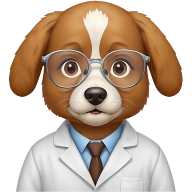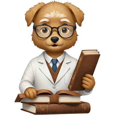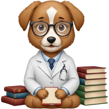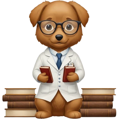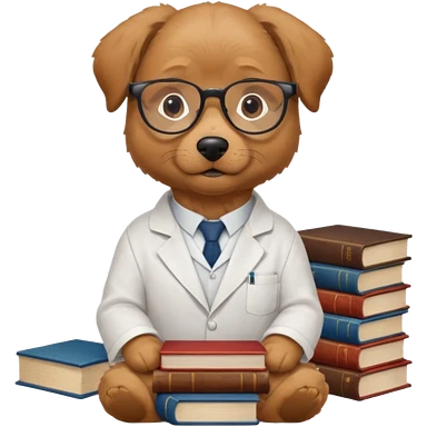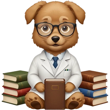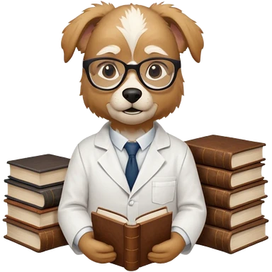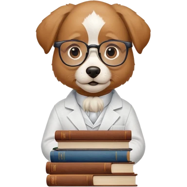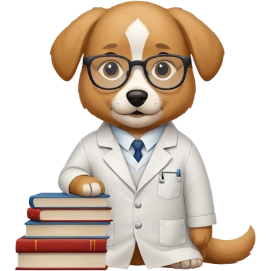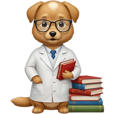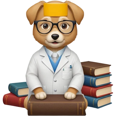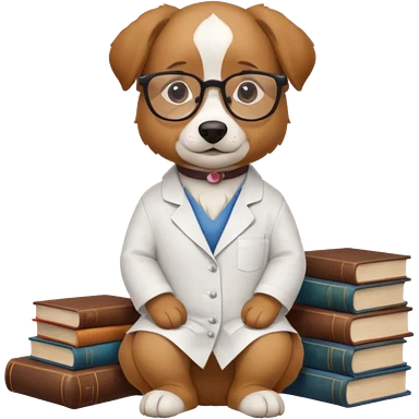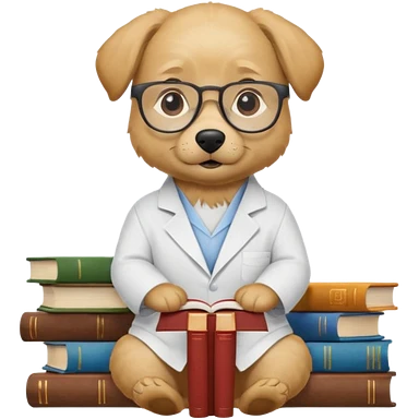 Wise dog with glasses, wearing a lab coat, perched on a stack of books. emoji