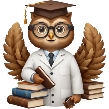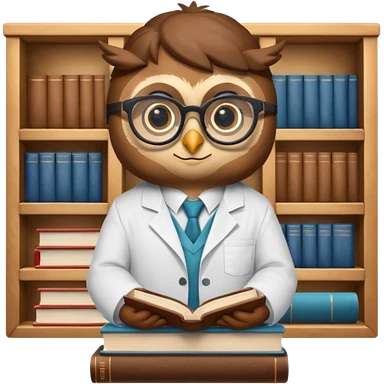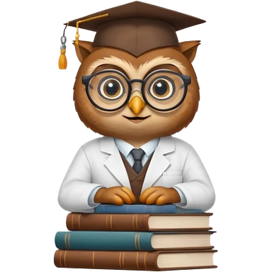 Wise owl with glasses, wearing a lab coat, perched on a stack of books. emoji