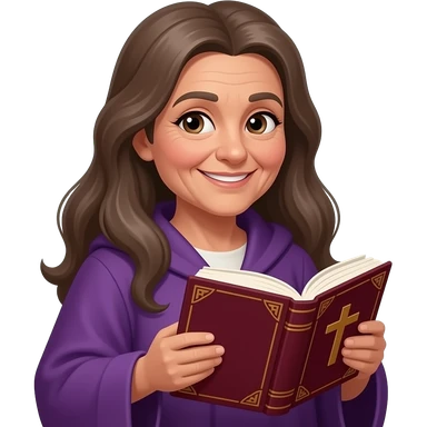 wise old woman slight smile with long brown grey hair purple robe tan skin warm holding open burgundy book that has a cross on it emoji