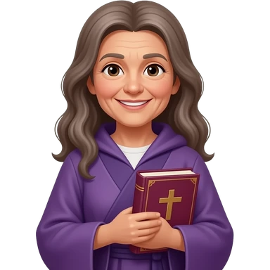 wise old woman slight smile with long brown grey hair purple robe tan skin warm holding closed burgundy book that has a cross on it emoji