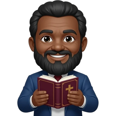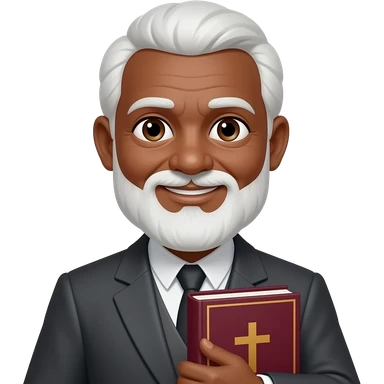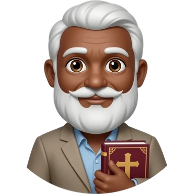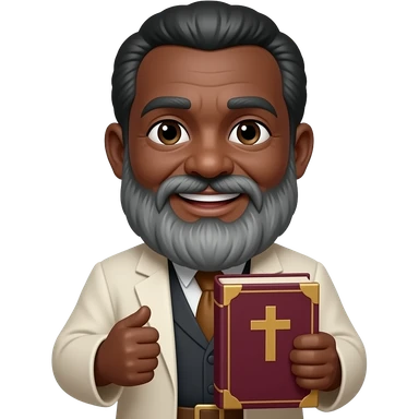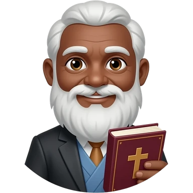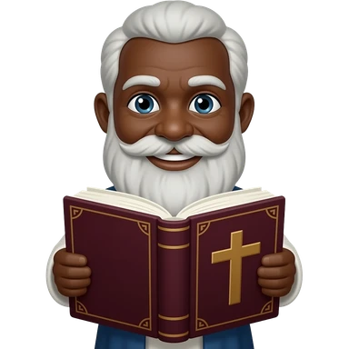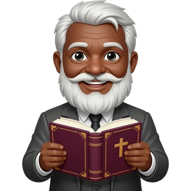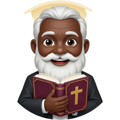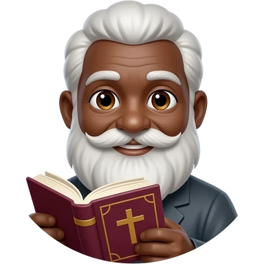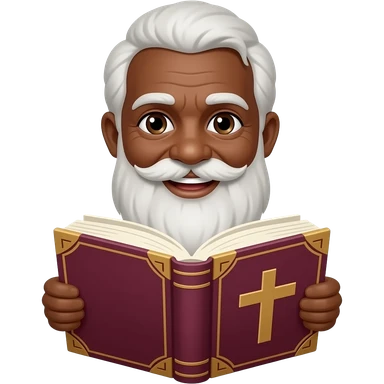 wise old man with greying black hair white beard black skin smile with burgundy book that has a cross on it emoji