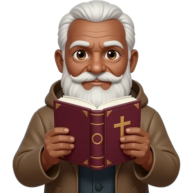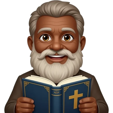 wise old man with greying brown hair white beard brown skin smile with book that has a cross on it emoji