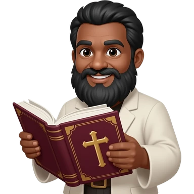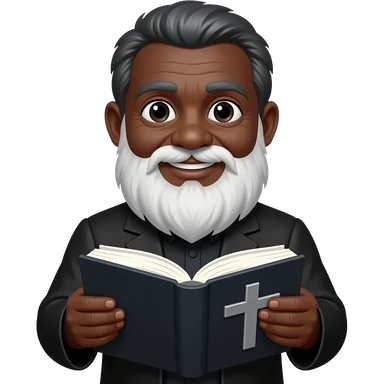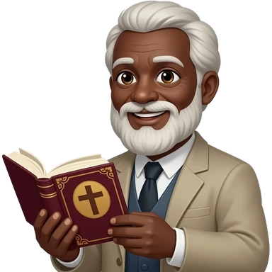wise old man with greying brown hair white beard black skin smile with book that has a cross on it emoji